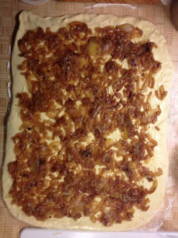 You are currently viewing caramelized onions spread on dough from Buttermilk-Caramelized Onion Pull-Apart Rolls at The Dainty Dot.