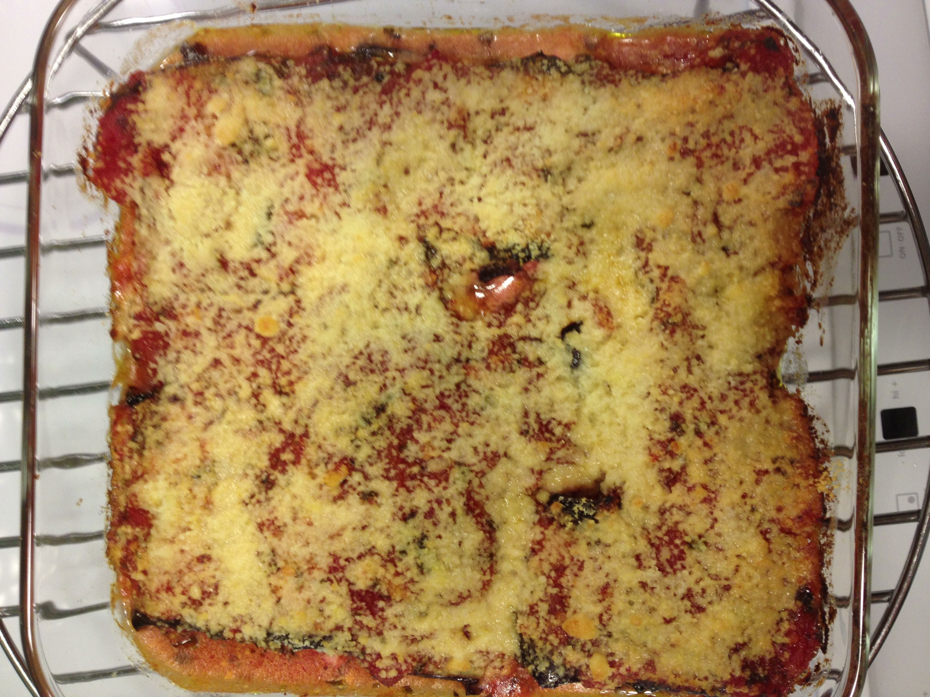 6. Lay down about 1/4 cup of the tomato sauce in the bottom of an 8×8 baking dish. Place eggplant rolls in dish on their sides (not standing up). Fit as many as you can in there. When done, generously spoon sauce over the surface—but you don’t want it soaking wet, either. Find the happy medium. When done, sprinkle a coating of grated Parmesan on top and cover with foil.