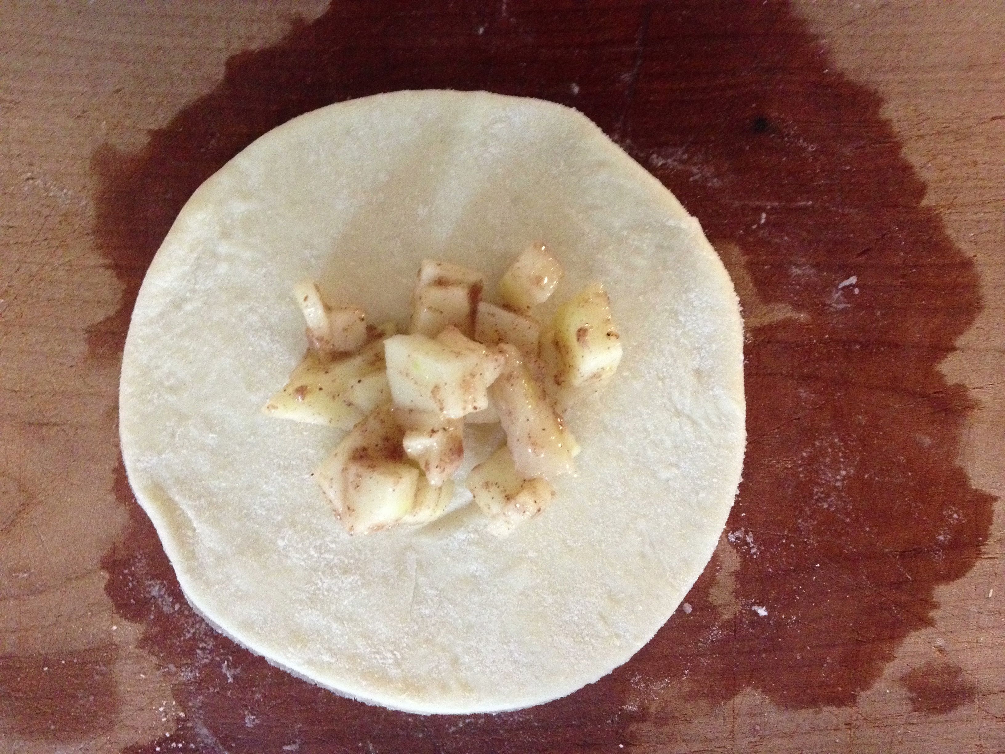 - The filling I made was tasty but 1) wasn’t juicy enough – maybe more sugar or let it sit longer? and 2) not enough of it in the pie. But that’s all I could fit in the dough rounds while still being able to close them securely. I’ll just need to experiment more, won’t I? One thought is to slice the apples (or peaches) lengthwise and layer the slices in the center of the dough rounds.