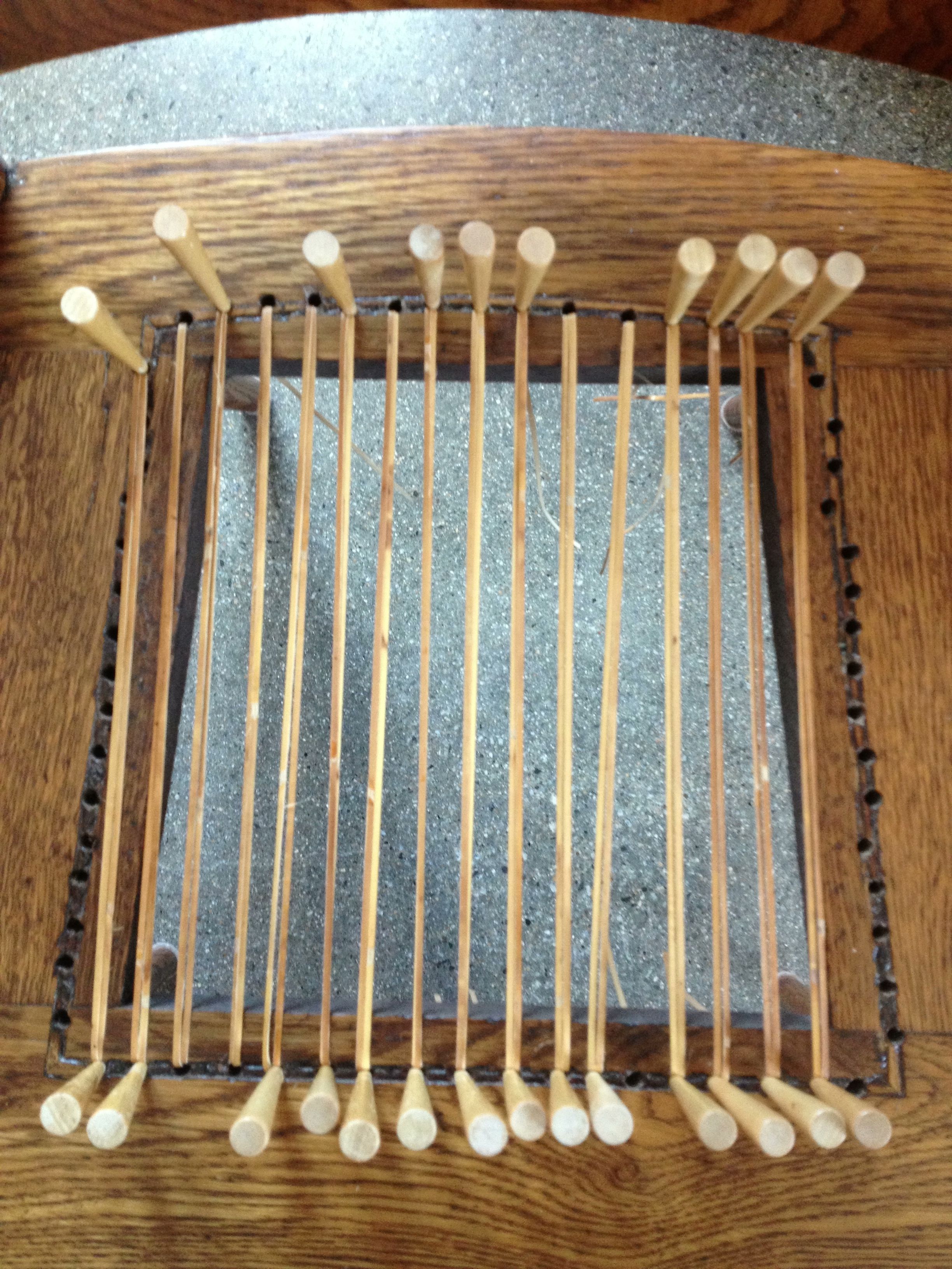 First step: I work with the vertical strips first. Place one cane strip in each hole, secure with a pin, and thread it through to the opposite side. You can use a really long strip and weave it under and through to the adjacent holes.