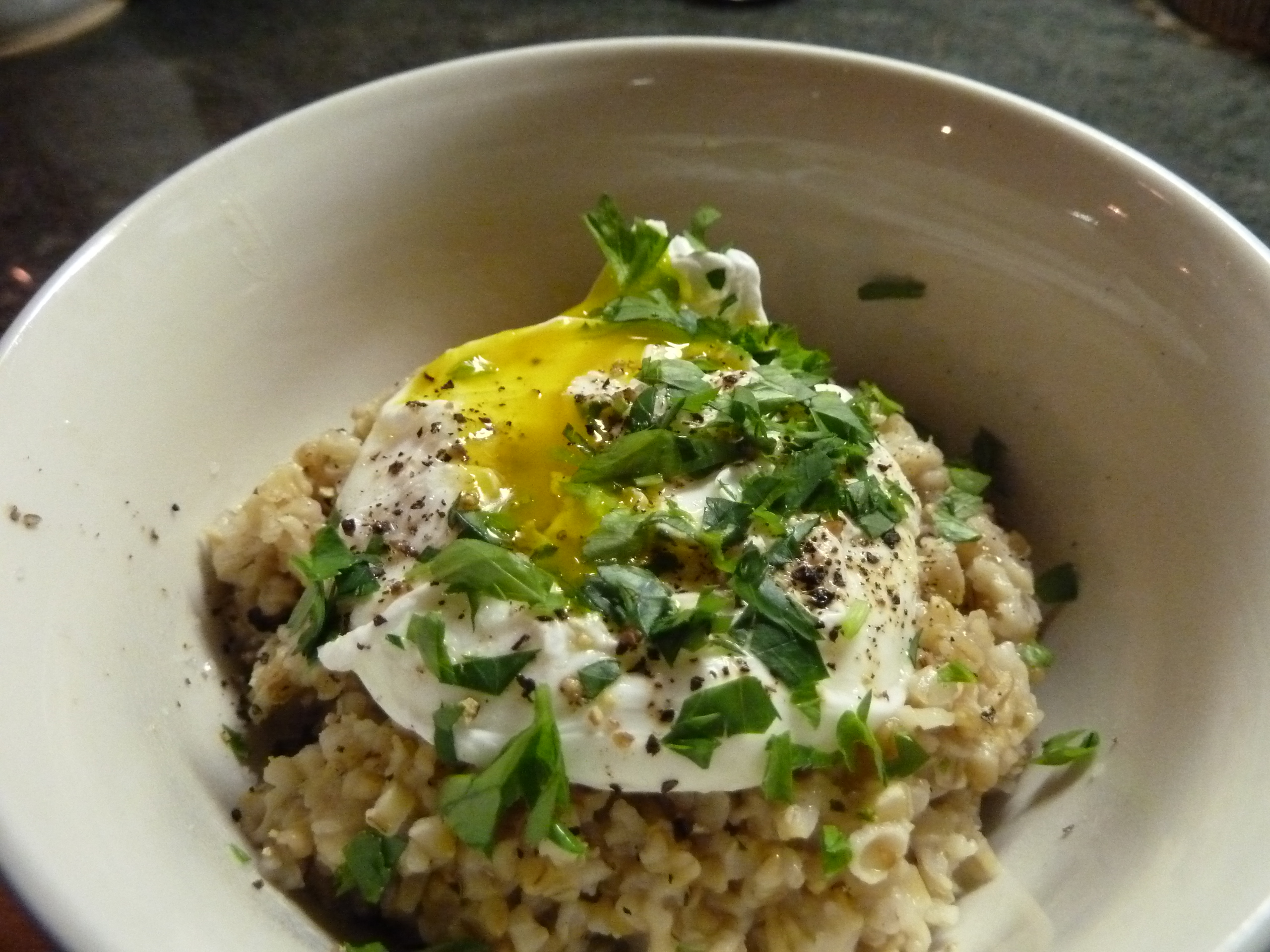 For my first time exploring of the savory side, I tread a simpler path. I topped my Steel-Cut Oats with a poached egg, black pepper and parsley. Yeah, delicious. Really delicious.