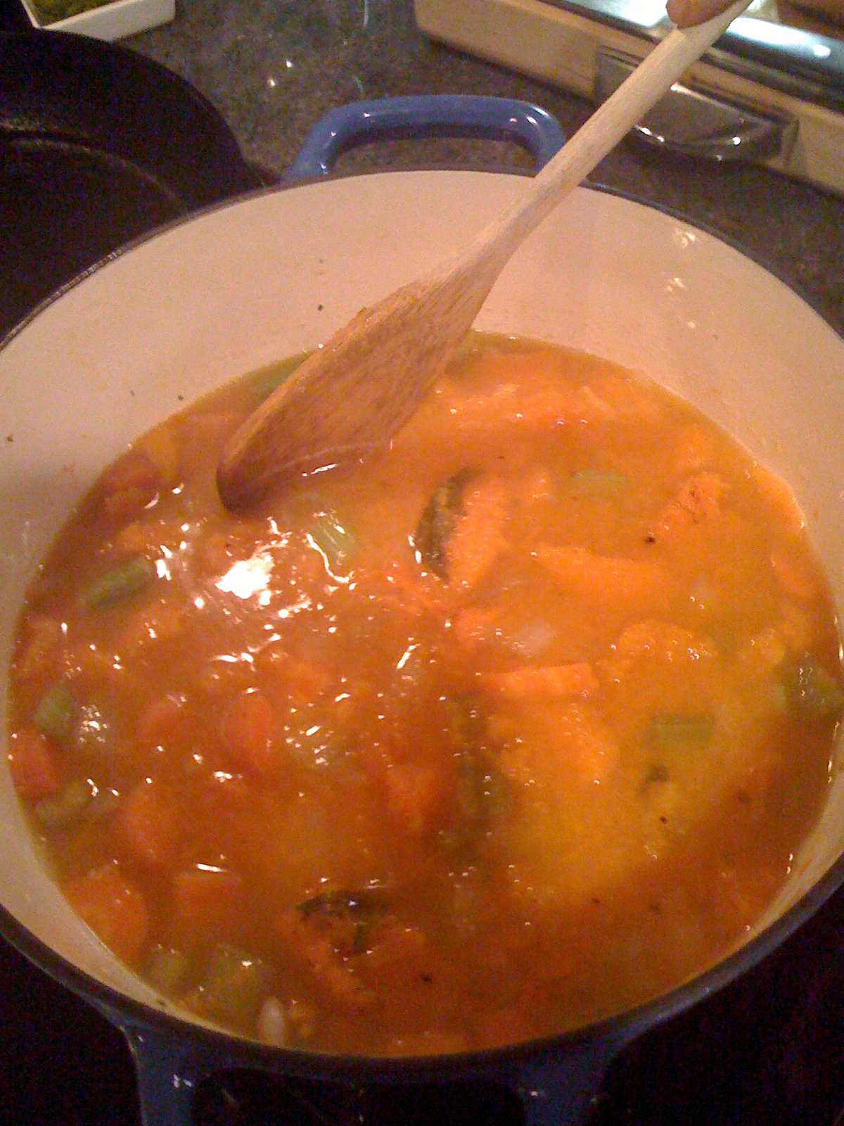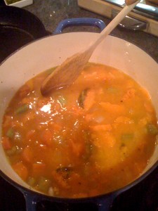 -When squash is cool enough to handle, scrape the squash from the skin and add to the vegetables. Add enough veggie stock or chicken stock to cover everything. It usually takes about 4-5 cups. Bring to a boil. Turn heat down and simmer for about 30 minutes.