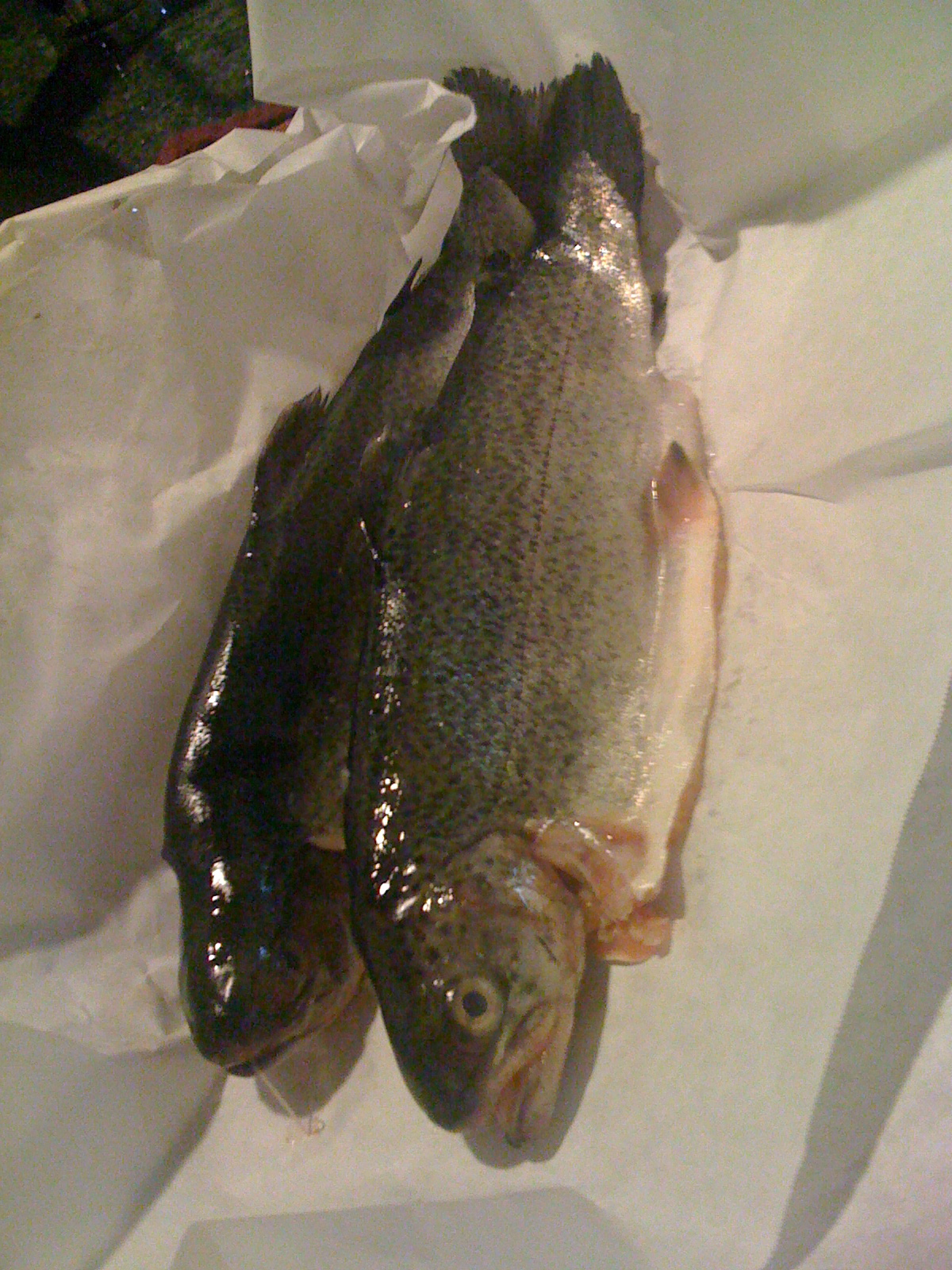 This meal was based on a recipe we saw once on a Food Network program hosted my Michael Chiarello, Lunchbag Swordfishwith Mediterranean Tomato Sauce and Linguini. Except sans swordfish and linguine. Morse Fish Market didn’t have swordfish, but they did have these cute lil’ whole filleted trout. Foodie’s had rainbow Swiss chard on special, especially ideal since eating your greens is a very healthy thing. And, last deviation, no one needs linguine when whole wheat Israeli cous cous makes such a nice side dish.Oh, wait – the last deviation: There was absolutely no lunchbags used in preparing this meal.