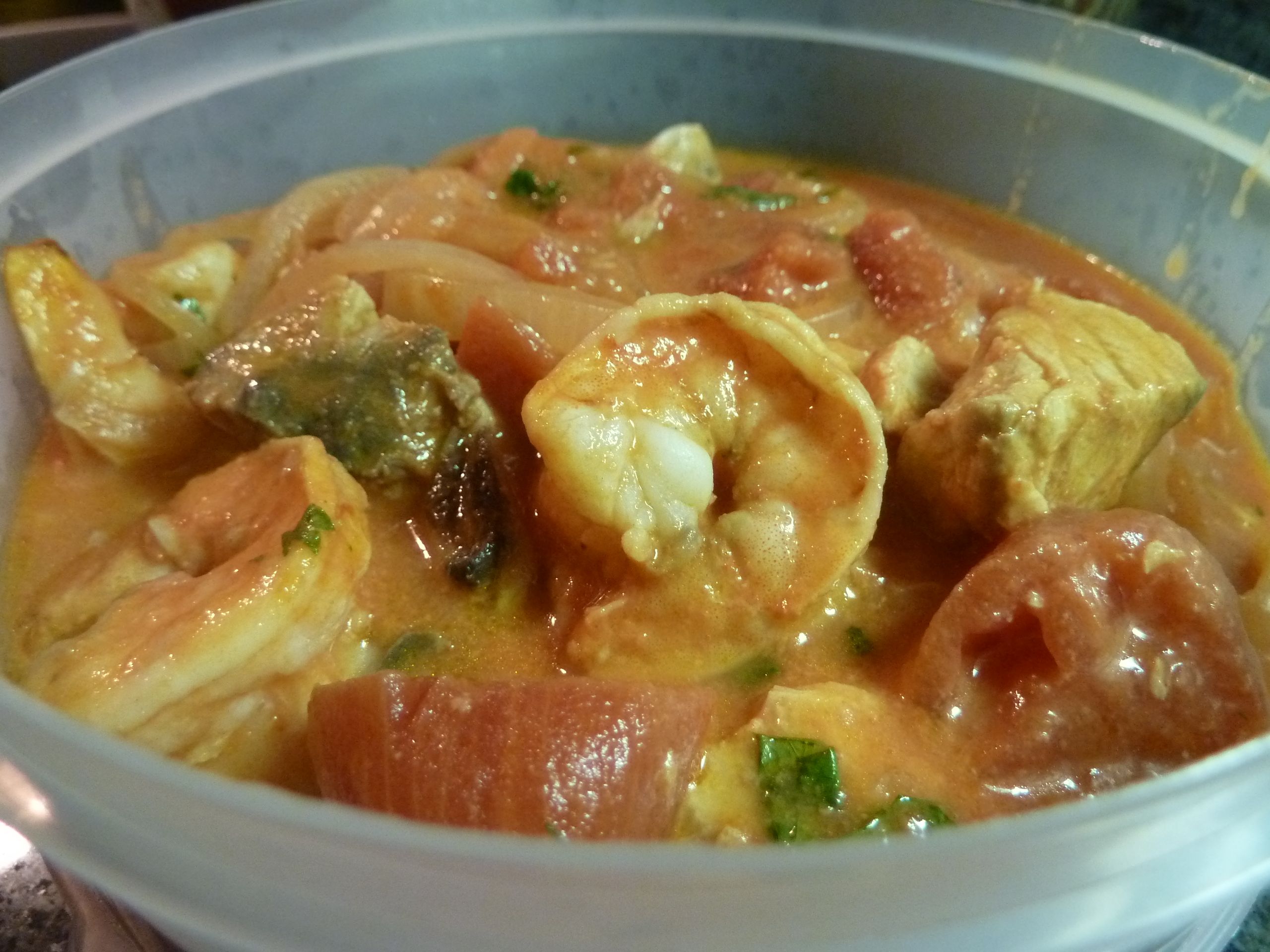 -Turn up heat a tad and bring the mixture to a boil. Once boiling, add the limed fish, the hot sauce (try half the amount first then add more after afterward) and the coconut milk. Stir it up again and let it heat to boiling. Reduce heat to medium-low and until the flesh starts to flake, about 10 minutes. IF you are using shrimp, add the shrimp separately from the fish, about 5 minutes through that cooking period.