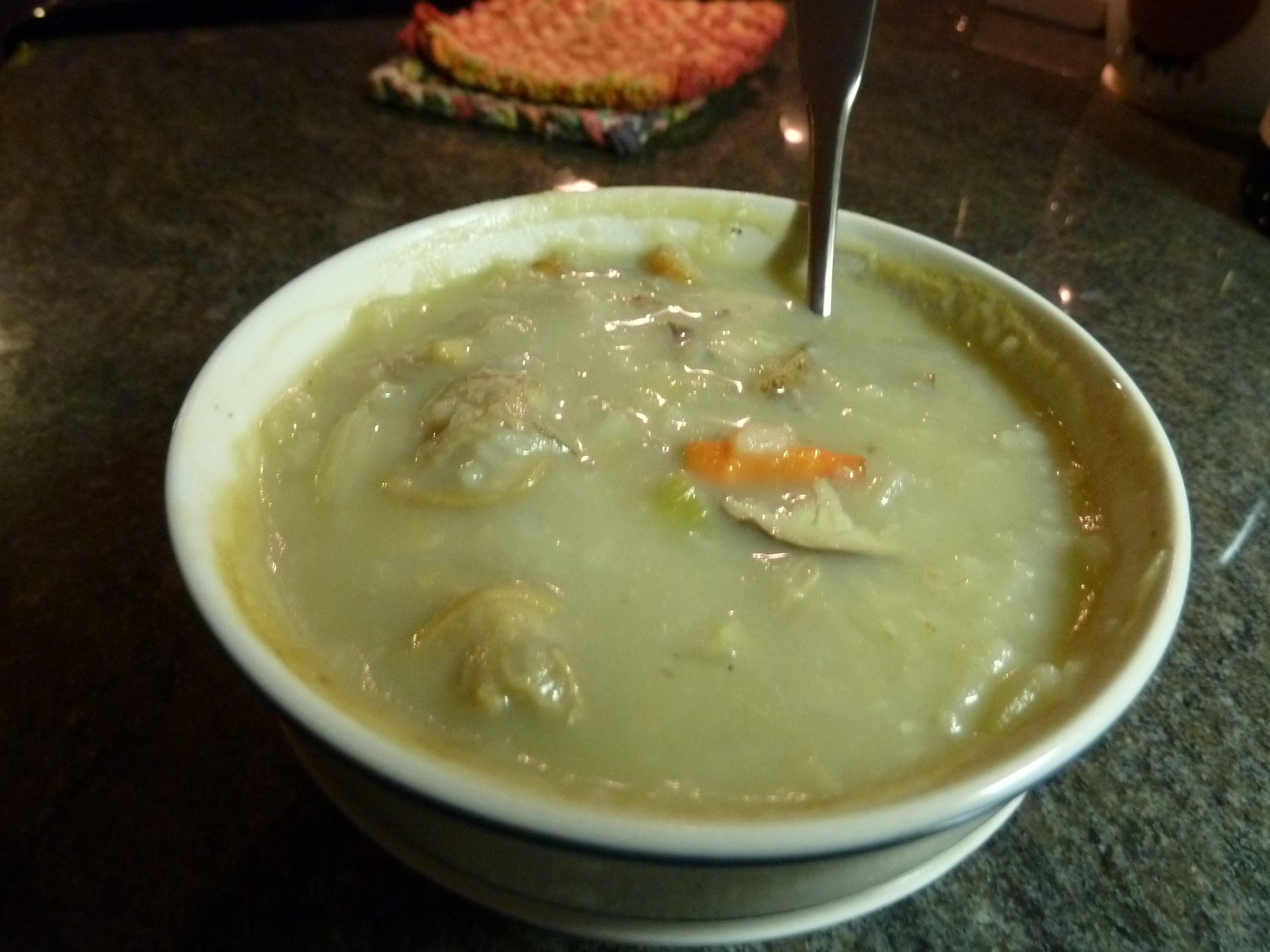 -When the potatoes were done (15 minutes or so), I used an immersion blender to break down the potatoes, but not completely. I wanted to leave some chunks, but also give the illusion of some cream in the broth, so I let my starch be the cream substitute. To the pot I added my cooked veggies and the quart plus of clams, warmed the mixture through and wished I had some crusty bread to serve along with it.