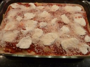 -Next, spread some of the ricotta – as much as you’d like – over the veggie layer. Dot with slices of mozzarella. A little cheese, a lotta cheese – whatever you want.
