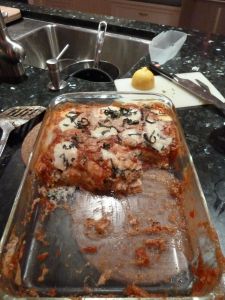 -When you are done layering, you’re going to top with a layer of pasta, then a thin coating of sauce. Then top with as much mozzarella cheese as you like. And a dusting of parmesan, too. Done!
