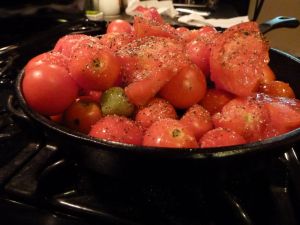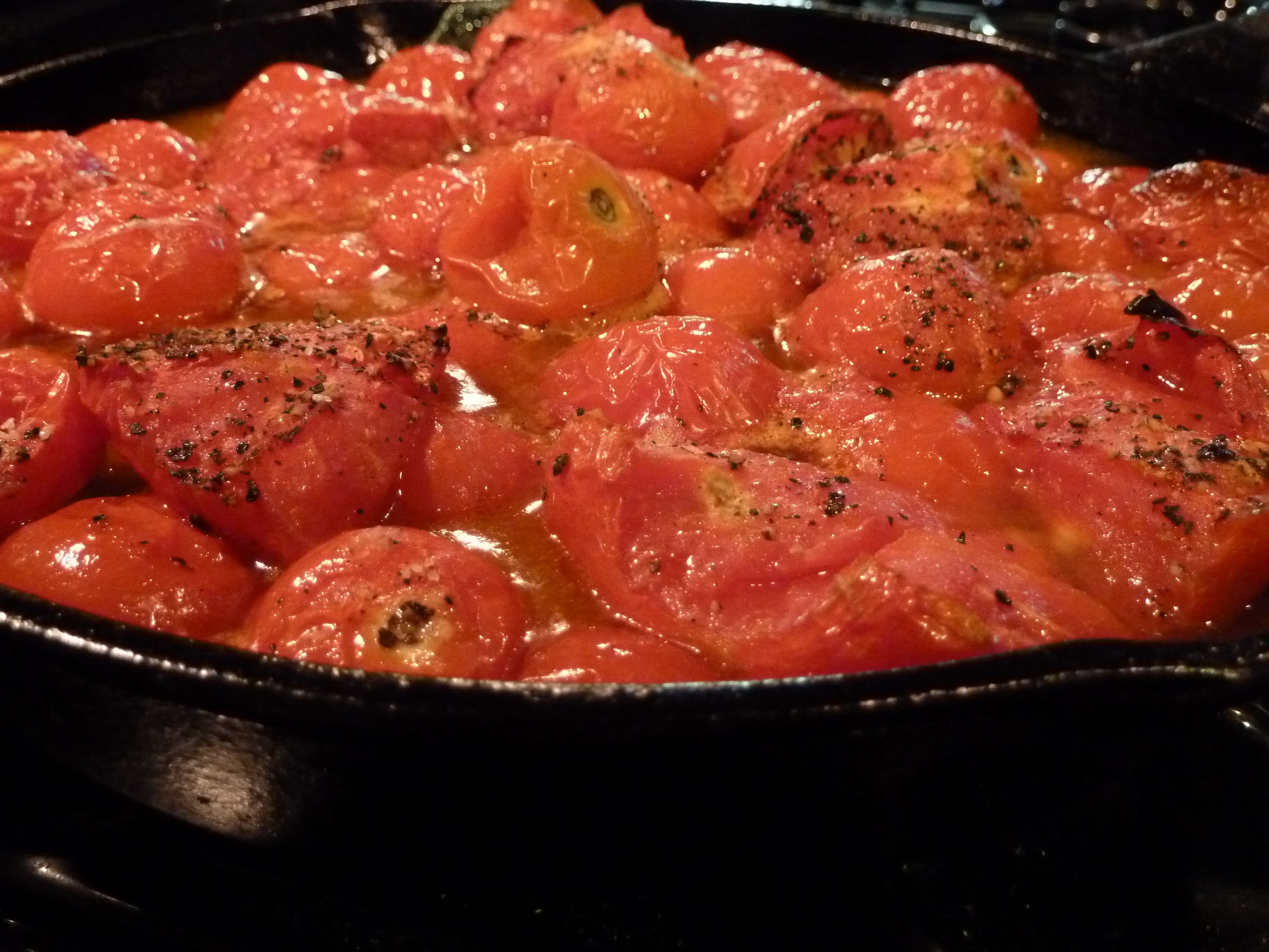 Step 1: Put about 2-3 lbs. cherry tomatoes in a cast iron skillet. Add a couple of tablespoons evoo, sprinkle with kosher salt and give it a couple of turns of fresh ground pepper.