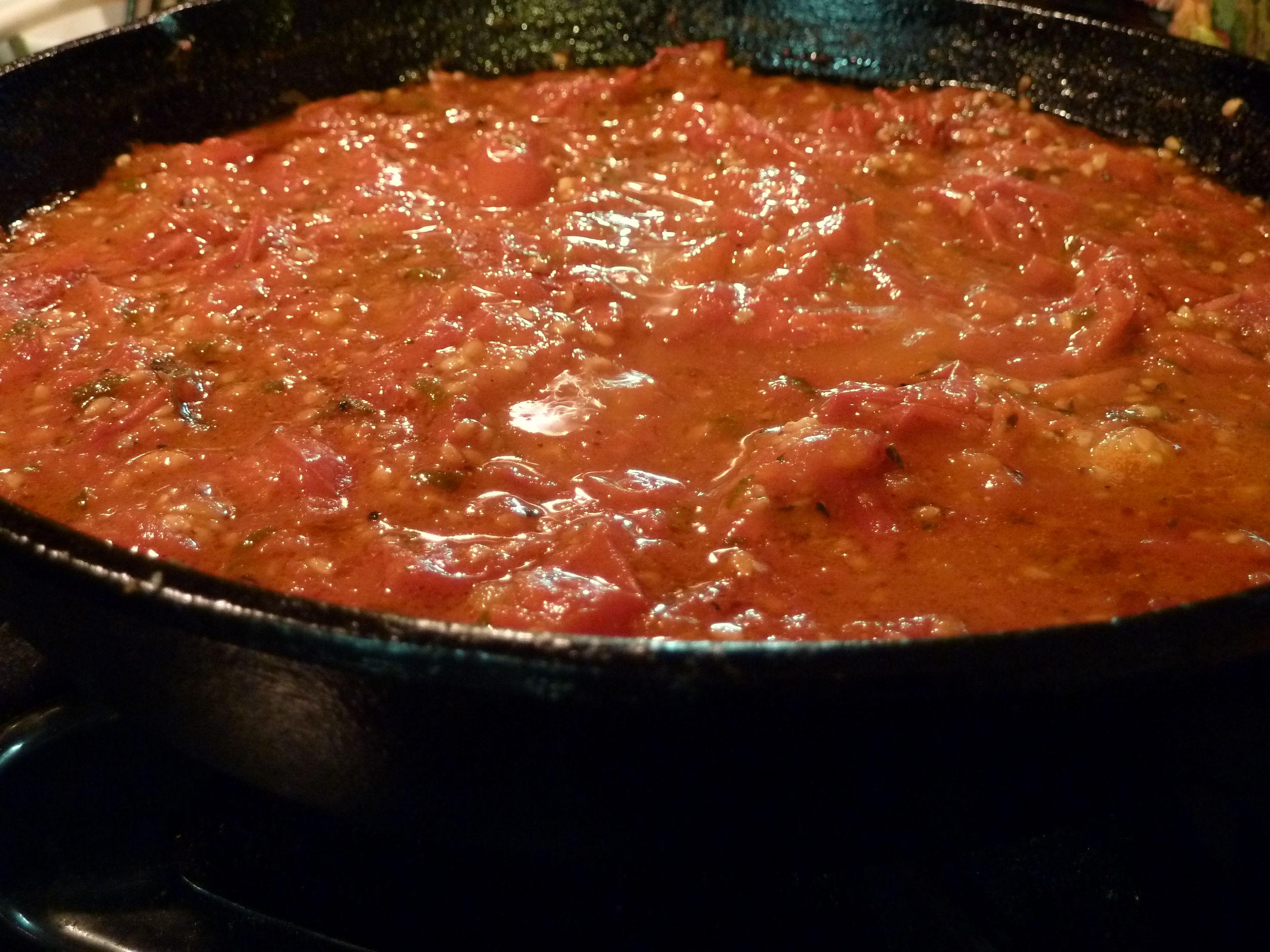 Step 2: Your gonna get lots of juice from the tomatoes, and you want to let it cook off. And you also want the flavor of the tomatoes come through more and get the sauce a bit thicker. So, take the skillet out of the oven and put it on the stove top over a low flame. Add 2-3 cloves of crushed garlic. Add some herbage; whatever you like. Fresh thyme or basil. Will it top a pizza? Add some chopped fresh oregano. 2Tbs is about right. Taste it for seasoning and add salt/pepper if you need to. And cook loooow and sloooooow. How long? Until enough liquid has cooked out to get the sauce to the thickness you like. In my case, 2 hours.