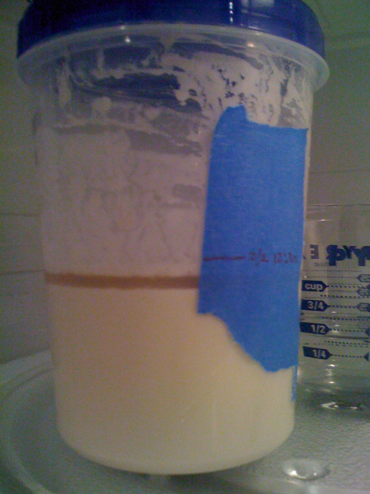 Wednesday, 5:58 p.m. I did a little YouTubing. This liquidy layer is normal. I think. It was on YouTube, so it must be right, right? And Baby Dough is supposed to be a bit runny. I think. My thought is I don’t have a whole heckuva lot of yeasties in there so it’s not bubbling tons. But it is bubbling.