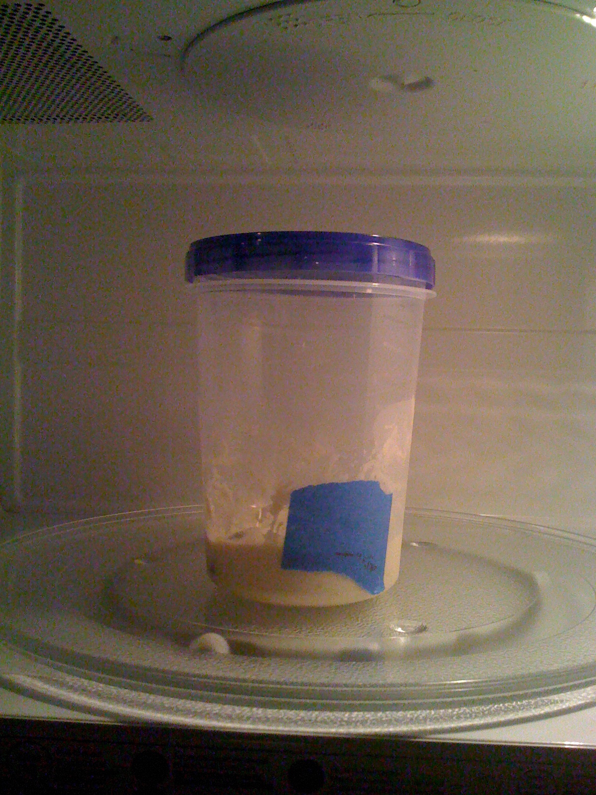 Oh, you’ll also see that it’s in my microwave. It’s a bit warmer in there. And, as soon as I’m done posting this, I’m going to heat a cup of water to boiling and keep that in there with the levain. The dissipating heat will warm the microwave hopefully 1o degrees or so and keep the levain warmer for a few hours.