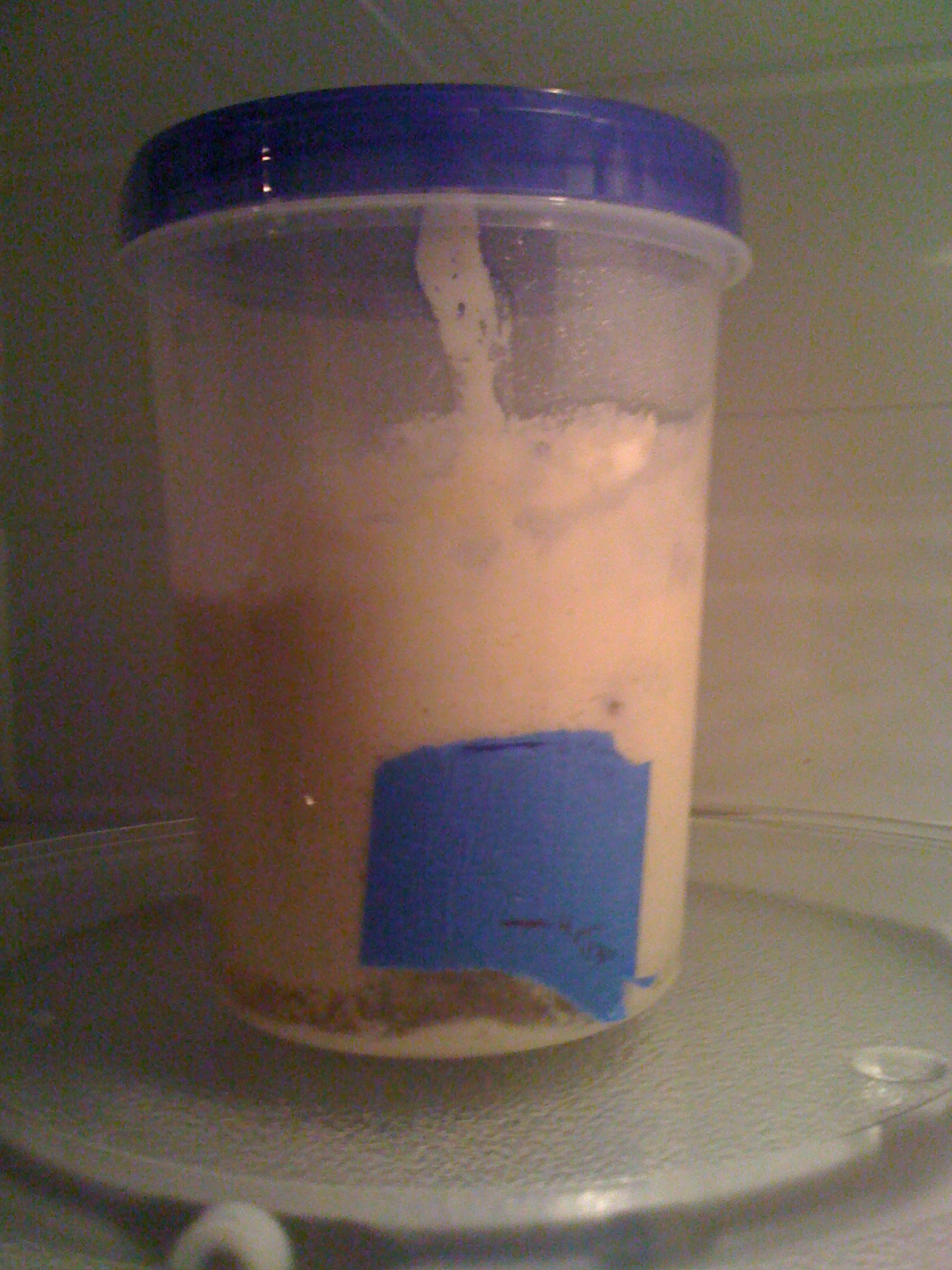 Added 36 grams flour. Mixed thoroughly. Put back in the microwave. Waiting another 12-24 hours.