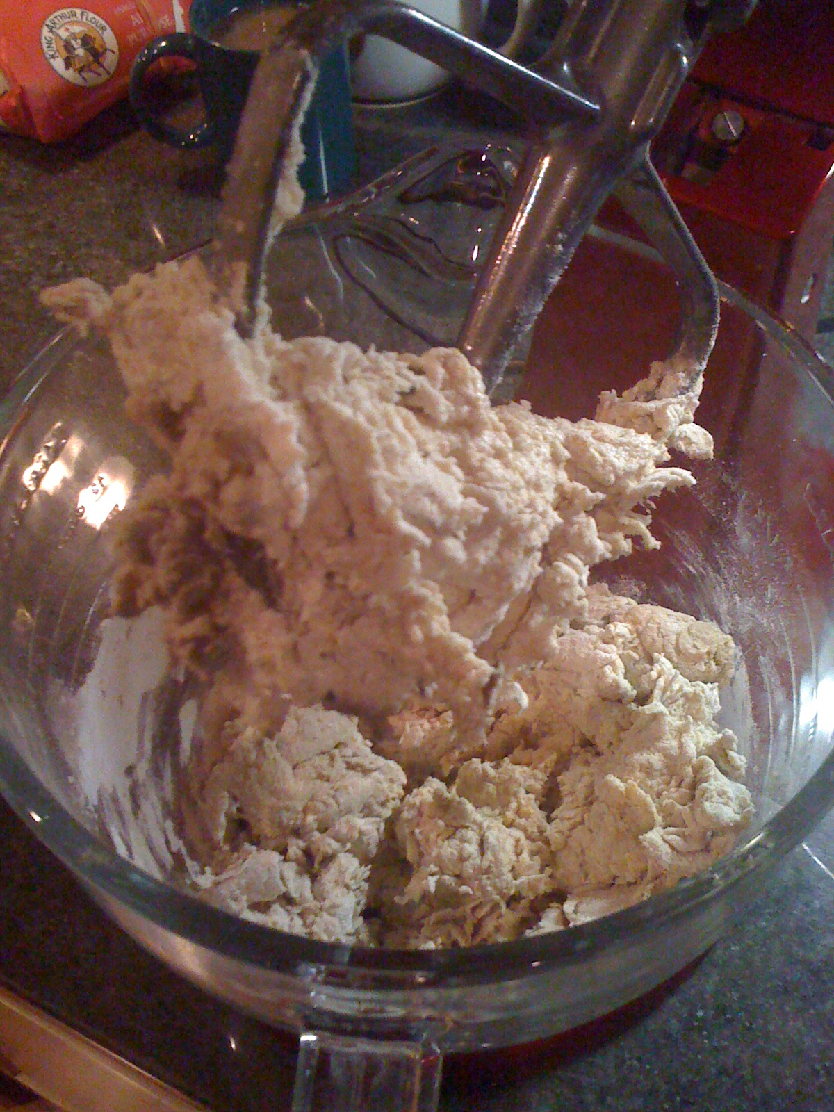 - Mix flour(s), yeast, salt in bowl of Kitchen-Aid mixer. Attach a paddle (oiled with Pam or something like that) and secure bowl to mixer.