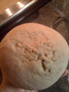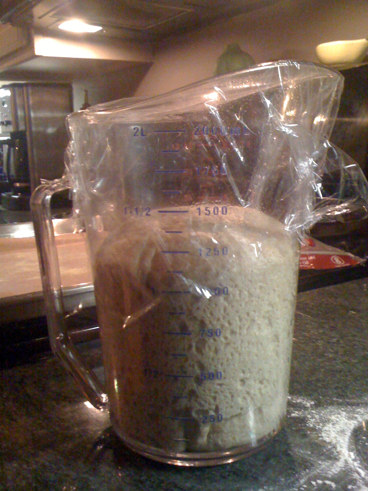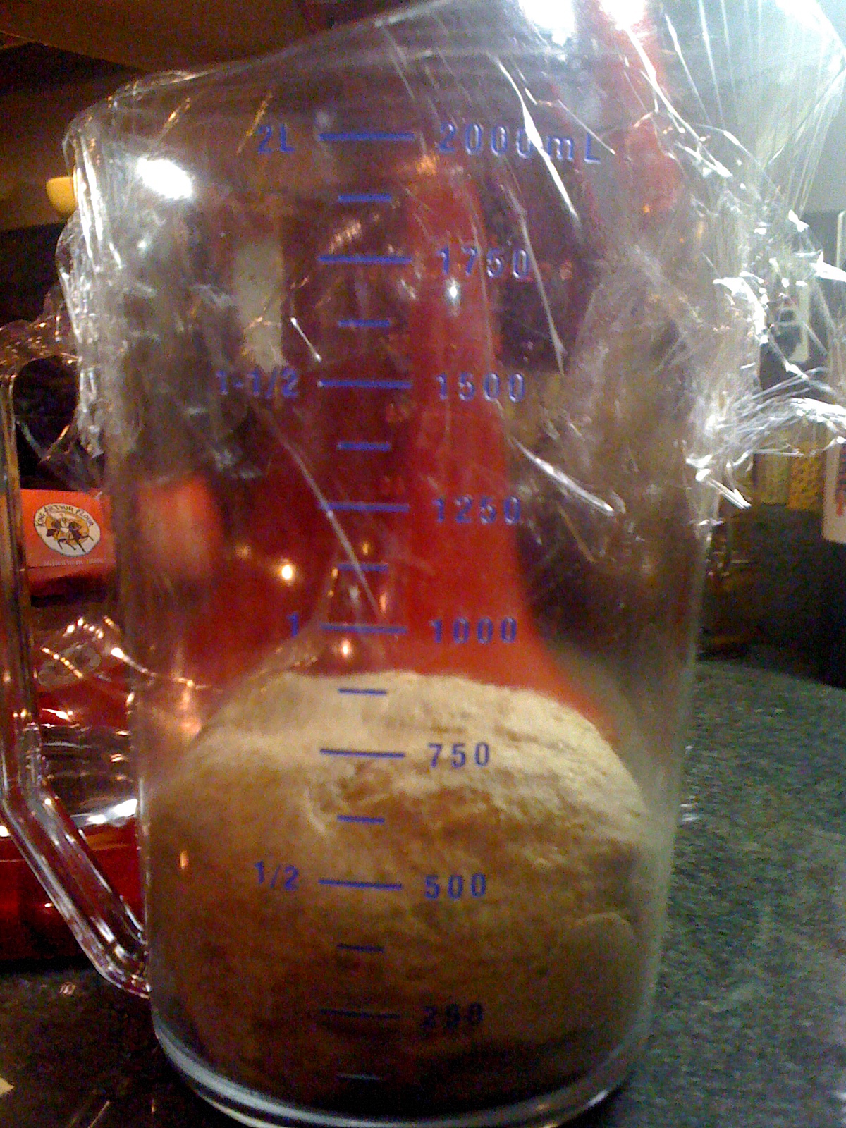 - After about 5 minutes, the dough should look like it’s swollen just a tad and look a bit like a soft baby’s bum. At this point, take out the dough and put into an oiled (or Pammed) bowl. I like to put my in a large (2 quart-sized) plastic measurer with markings. That way you can tell how much the dough has risen. Next, cover the container with plastic wrap. Put in a warm draft-free space.