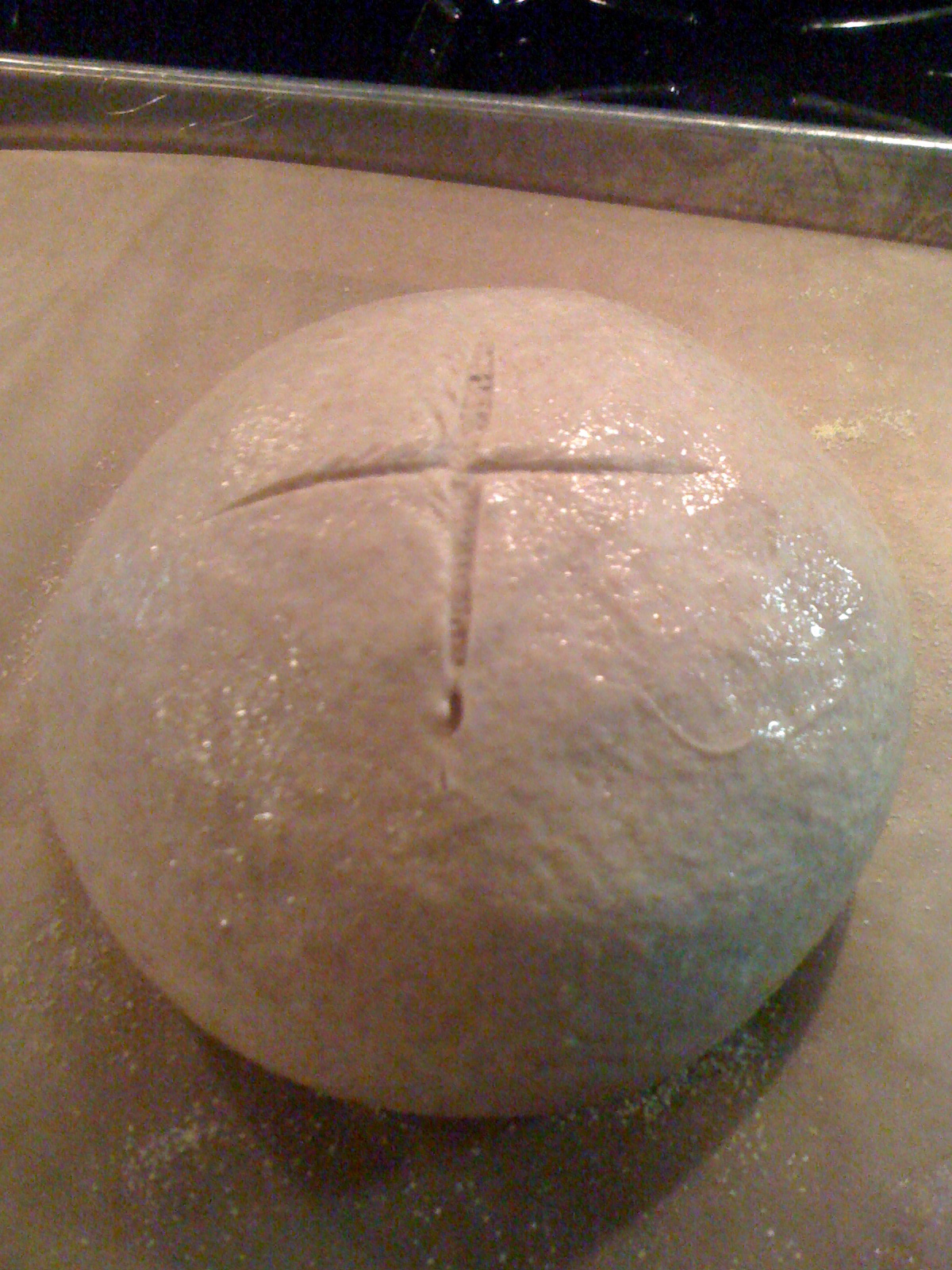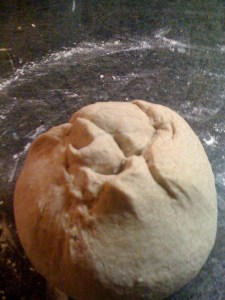 I made the dough, let it autolyze, formed it into a ball, let it rise, punched it down, let it rise again, separated into two doughs, formed boules and let them rise again – seam side down – in floured baskets. The dough looked and felt great. So far, so good.