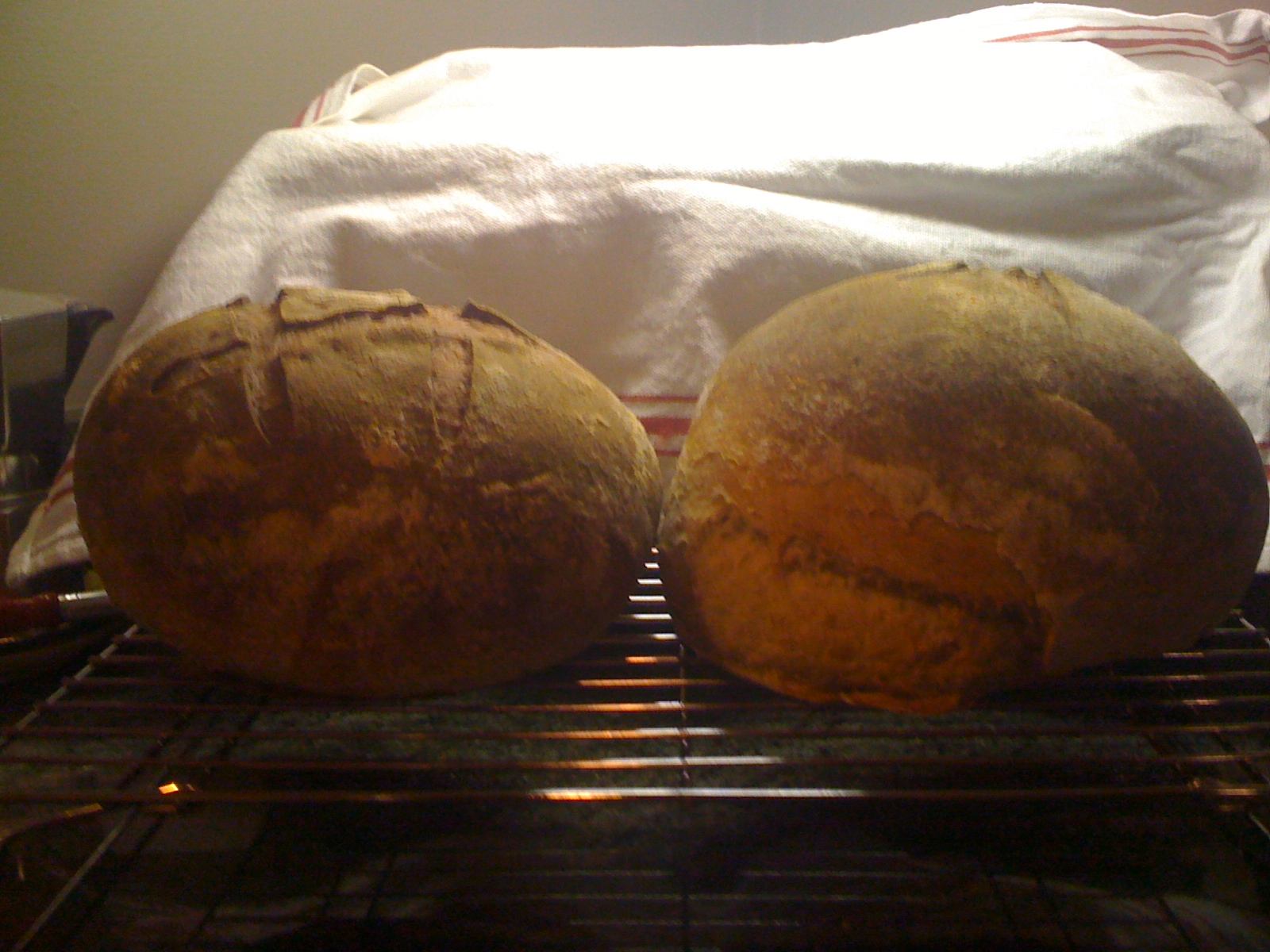 The one on the right was the seam-side down. Even though I scored the top, the steam escaping the loaf escaped through the seam on the bottom, causing it to tear.
