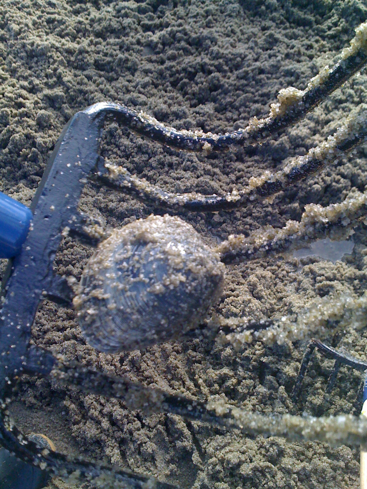 Armed with an official clam rake, purchased new for our first clamming experience, we joined Karen and Robin at low tide on New Year’s Eve afternoon. We picked a spot east of town. For about 30 minutes we raked around the wet sand of the flats. Nothing. Okay, I lied. We found two clams – one of which was less than 1 in. thick and we had to dig back into its home.